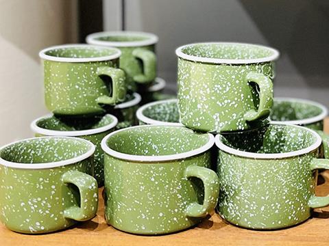 Reminding us of the place we'd rather be... enamel-look camping mugs continue to be a fun trend in drink ware.