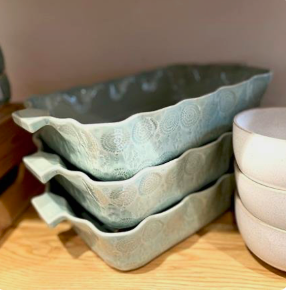 Baking dishes brimming with artistic detail including fine de-bossing, shapely frills and contrasting handles are the perfect vessel for wholesome home-baked creations!