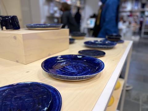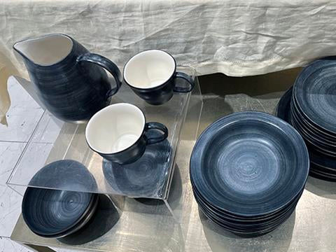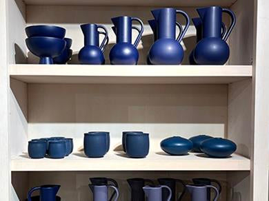 Bold cobalt brushed glaze dishes in high gloss steal the show.